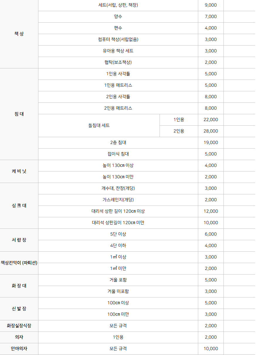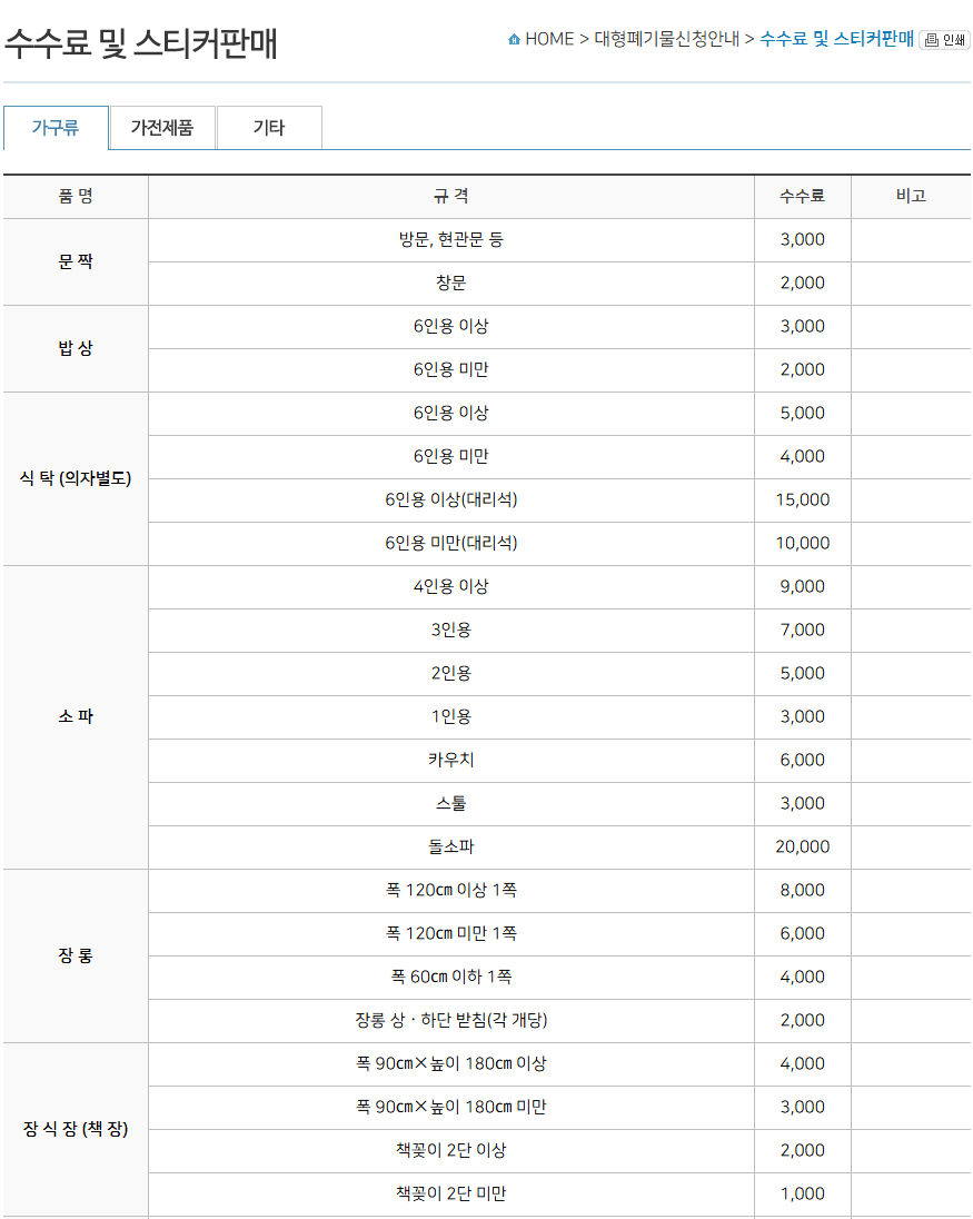 예를 들어 의자는 2,000원, 장롱은 8,000원 등 품목마다 가격이 다르며, 수원시에서 정해 놓은 기준에 따라 구매하셔야 합니다.